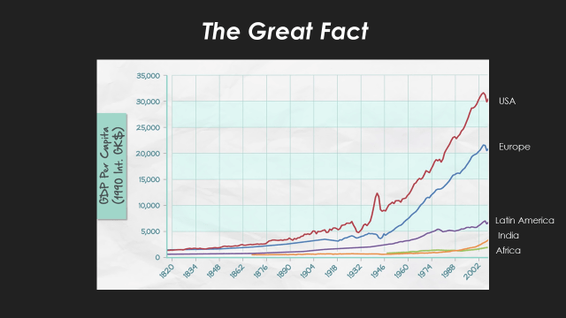 Una vez comprendido todo lo referente a las variables del crecimiento, la pregunta lógica es comprender si de verdad hemos logrado algún avance desde los tiempos de Smith. Pues bien, en los últimos 90 años, los ingresos globales han crecido de manera exponencial. Eso es verdad. Pero también esto ha ido acompañado de un incremento superior en la brecha entre países desarrollados y países en vías de desarrollo. Esto es lo que la economista e historiadora Deirdre Mccloskey (2010) llama “The Great Fact” o “La Gran Verdad” según la cual, los países lejos de converger tienden en realidad a diverger en sus niveles de ingreso en el largo plazo.