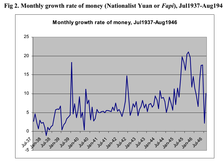 Es decir, entre 1935 y 1949, China experimentó una hiperinflación en que los precios subieron más de mil veces. La expansión monetaria fue tan severa que los centros de impresión nacionalistas fueron incapaces de mantener el ritmo, y la moneda china impresa en Inglaterra tuvo que ser volada sobre el Himalaya (Habbeger, 1988).