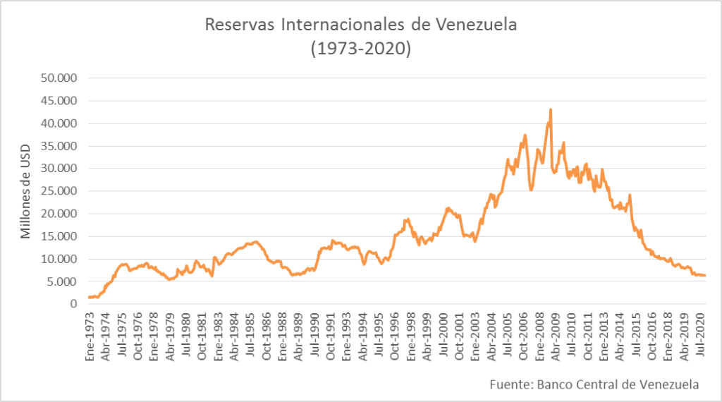 En la misma se visualiza la evolución de las reservas internacionales de Venezuela desde enero de 1973 a diciembre de 2020. Con cierta varianza a lo largo del período, se puede observar que la tendencia siguió, en general, una tendencia positiva exceptuando un período de estancamiento durante la década de los ochenta y primeros años de los noventa (Hay dos hechos importantes: Viernes Negro y el Paquetazo). Las reservas internacionales alcanzaron su pico en diciembre de 2008 impulsado en gran parte por incrementos de los precios del petróleo durante estos años, lo cual le permitió al país mayor entrada de divisas. Pero a partir de allí se evidencia un desplome exuberante de las reservas internacionales aunque el boom petrolero continuó hasta 2012. Para diciembre de 2020, las reservas de Venezuela se ubicaron en alrededor de 6.367 millones de dólares, ubicándolo en niveles similares a los de 1988 y 1979.