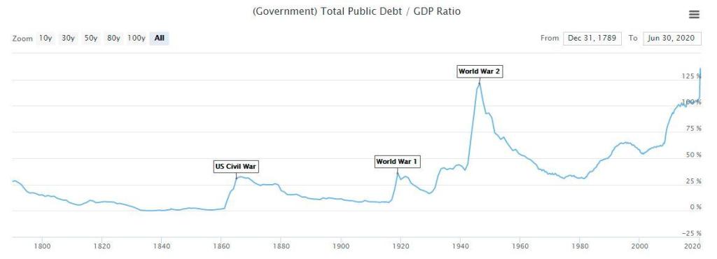 La tendencia a tomar préstamos por parte del gobierno ha cambiado a lo largo del tiempo. Véase por ejemplo Estados Unidos en la siguiente gráfica. Durante todo el siglo XIX y los primeros años del siglo XX su nivel de endeudamiento se mantuvo por el orden del 25% del PIB, con excepciones en la Guerra Civil y la I Guerra Mundial. Para esta época el pensamiento económico dominante era el de no intervención gubernamental, por lo tanto, la necesidad de endeudarse era limitada.