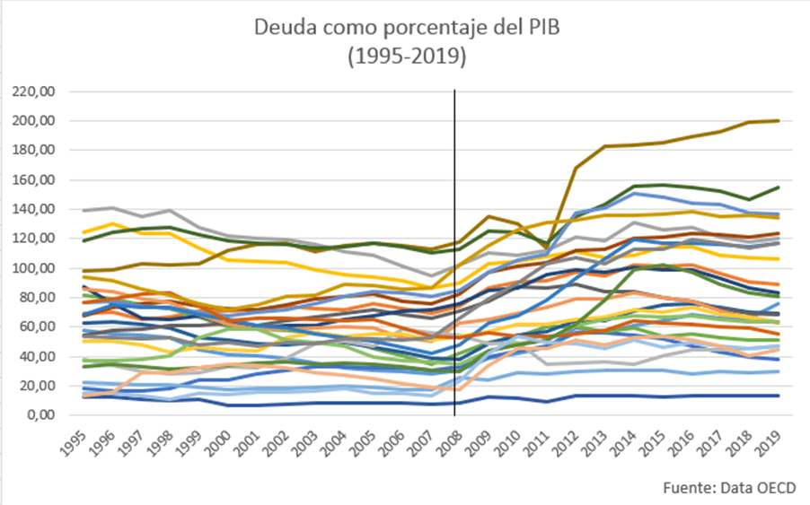 La Crisis Financiera del 2008 llevó a muchos países al borde del colapso y los dejó con pocas opciones. Se aprendió la lección de la “Gran Depresión” y esta vez, ante un escenario en el que muchas personas quedaban desempleadas y muchas empresas cerraban sus puertas, la estrategia aplicada fue la de estimular la deprimida economía mediante aumentos masivos del gasto gubernamental y, para ello, los países debieron acudir ante inversionistas que los financiaran. Como consecuencia, la deuda a nivel mundial explotó a niveles nunca vistos en años.
