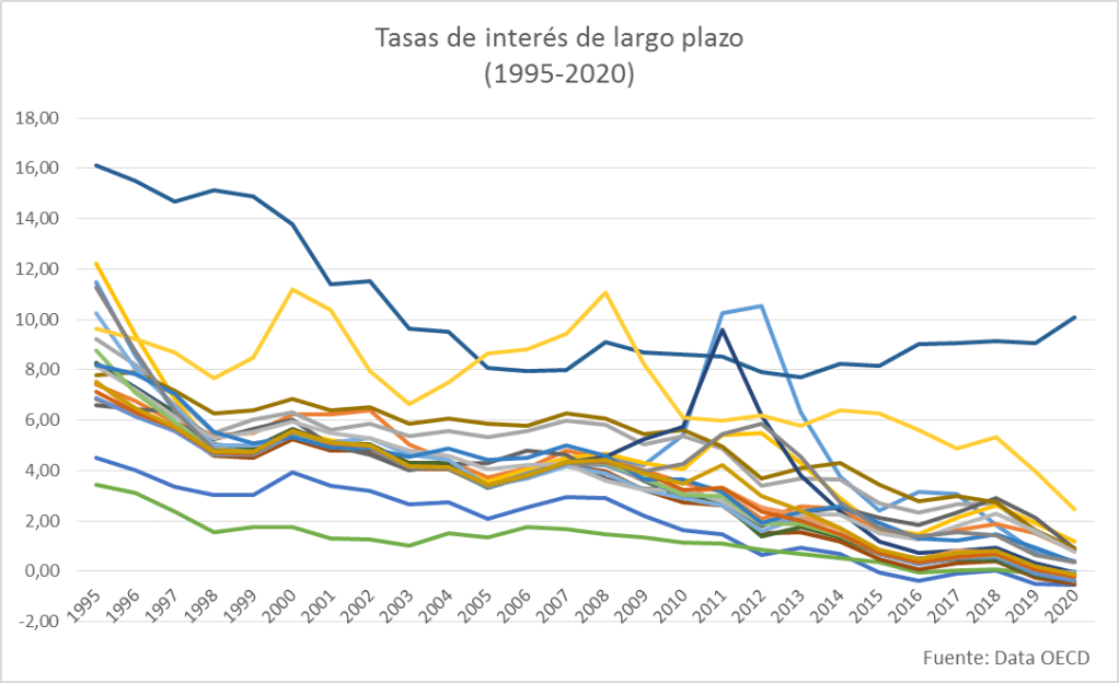 El experimento de la austeridad llevó a un nuevo consenso en el pensamiento económico cuyo principal ideólogo fue el economista Olivier Blanchard. Es importante resaltar que una de las principales responsabilidades de los bancos centrales como institución, es impulsar el crecimiento económico, manteniendo activo el consumo privado, lo que a su vez implica producción y generación de empleo. Sin embargo, cuando el consumo disminuye, se deben tomar medidas para estimular nuevamente. Una de estas medidas es la disminución de las tasas de interés ya que de esta manera se hace menos atractivo ahorrar y más barato endeudarse. Lo que Blanchard observó es que, a pesar de crisis y convulsiones, las tasas de interés de la deuda habían estado cayendo sostenidamente desde hace más de 25 años, haciendo que pedir prestado fuese cada vez más barato para los países.