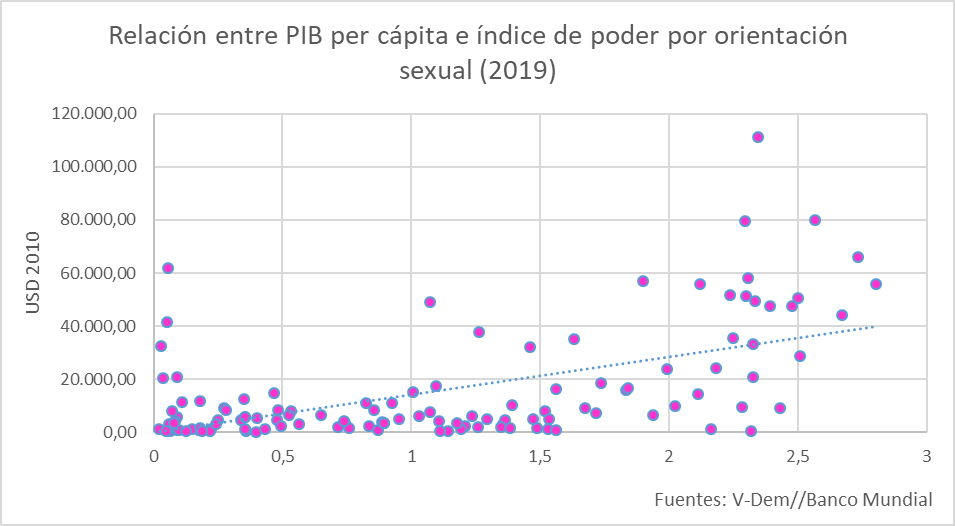 En un ejercicio similar, planteamos la correlación entre el PIB per cápita de 2019 de más de 100 países y los comparamos con el índice de poder por orientación sexual desarrollado por V-Dem y encontramos que la relación es positiva. Por lo tanto, existe una relación directa entre la participación de las minorías y el crecimiento económico de los países.