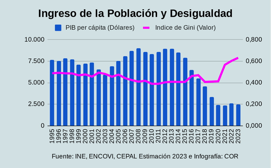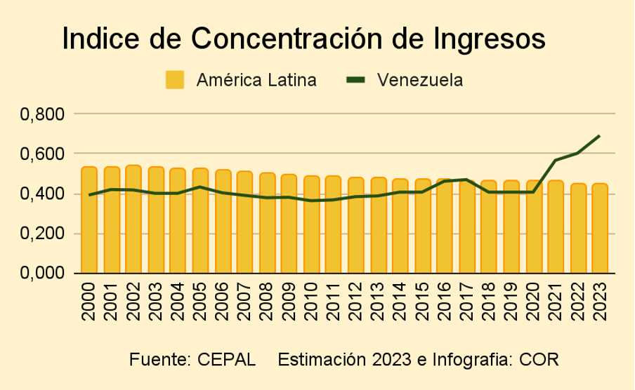 Venezuela fue uno de los países menos desigual de América Latina hasta 2012, cuando inició la tendencia al aumento de la desigualdad. De acuerdo a ENCOVI, el valor se elevó de 0,41 en 2014 a 0,66 en 2022. Las estimaciones colocan el índice de Gini nuevamente en alza este año, por su correlación con la pobreza que se prevé aumentará.