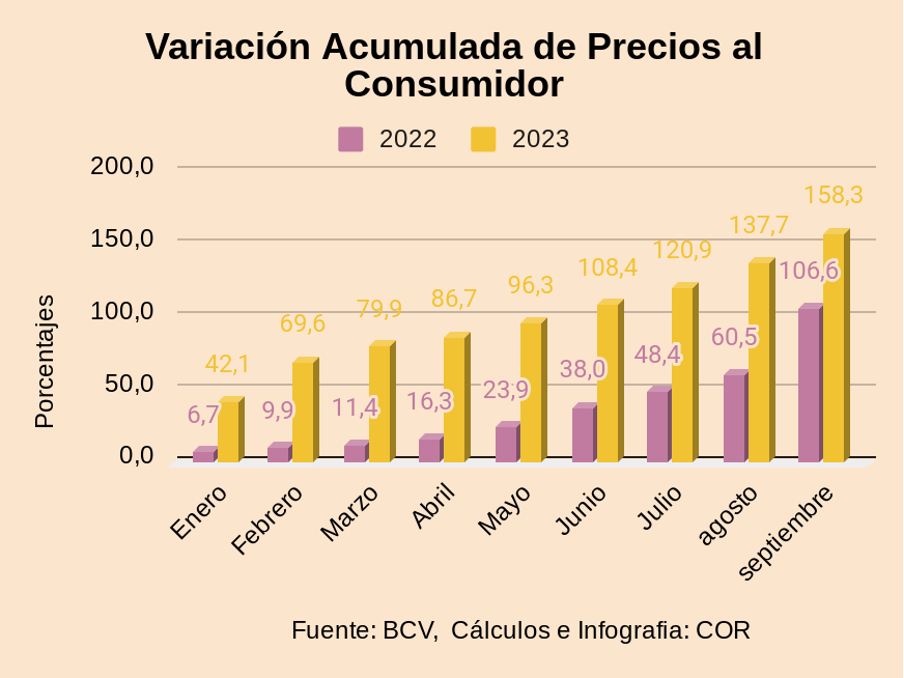 Mientras que en la evolución de la inflación, las cifras mensuales publicadas por el Banco Central de Venezuela (BCV), dan evidencia de la aceleración de la inflación hasta septiembre, proyectando una inflación para cierre del presente año muy superior al año 2022.