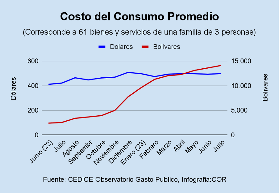 Las cifras del costo de la canasta de bienes y servicios publicadas por el Centro de Divulgación del Conocimiento Económico (CEDICE), evidencia su acelerado aumento, una drástica caída del poder adquisitivo de la población con salarios mínimos, y aún más los que no perciben remuneración.