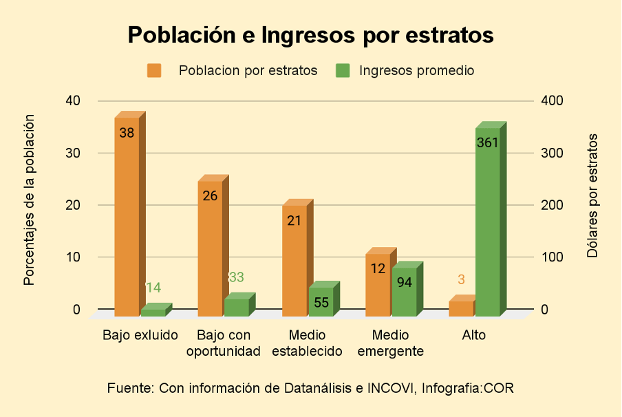 De acuerdo a un estudio sobre los estratos socio-económicos realizado por Datanálisis, identificaron la modificación de la clasificación convencional de los estratos sociales. Esta información, en el presente artículo, fue cruzada con la información de ENCOVI referida a la población por ingresos promedios en la actividad económica, ajustada a quintiles, desde los más bajos ingresos a los más altos.